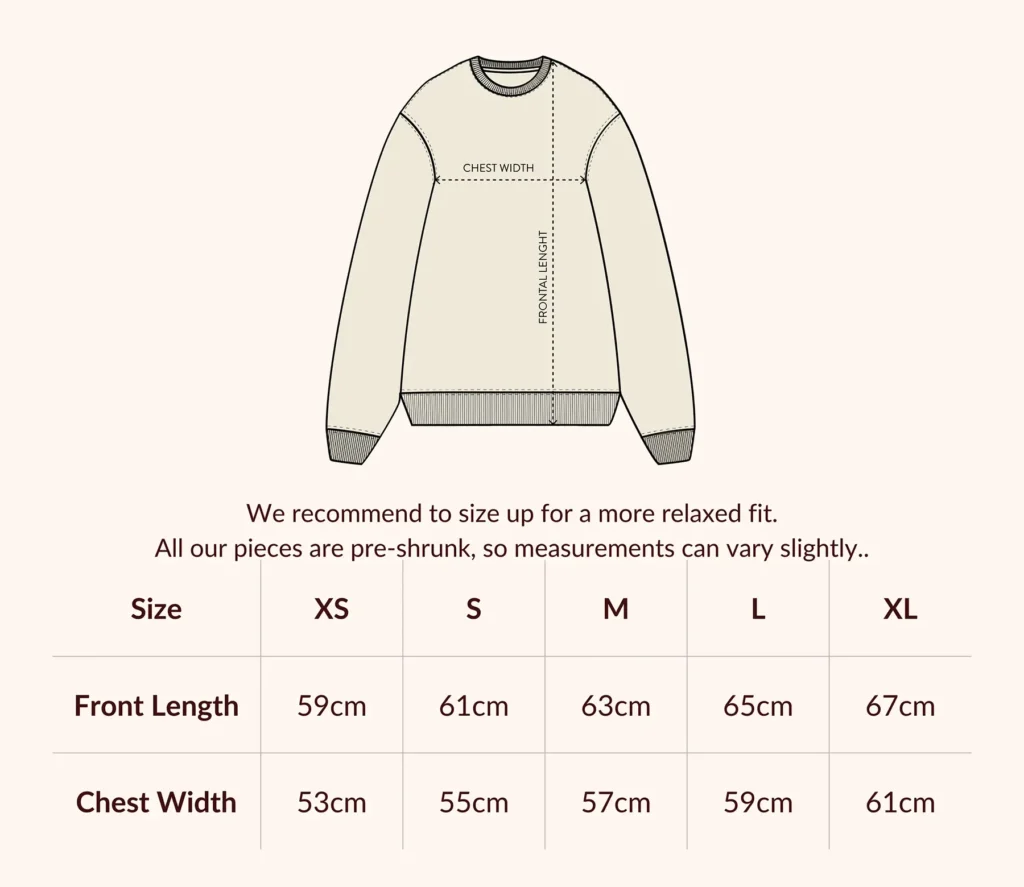 This is a slightly cropped fit. For a relaxed fit, it’s recommended to size up.
