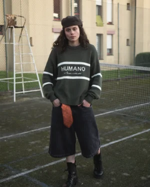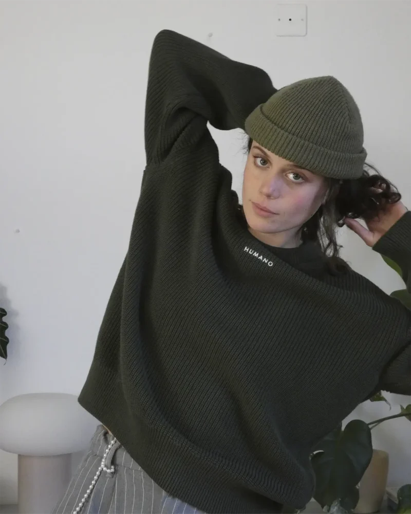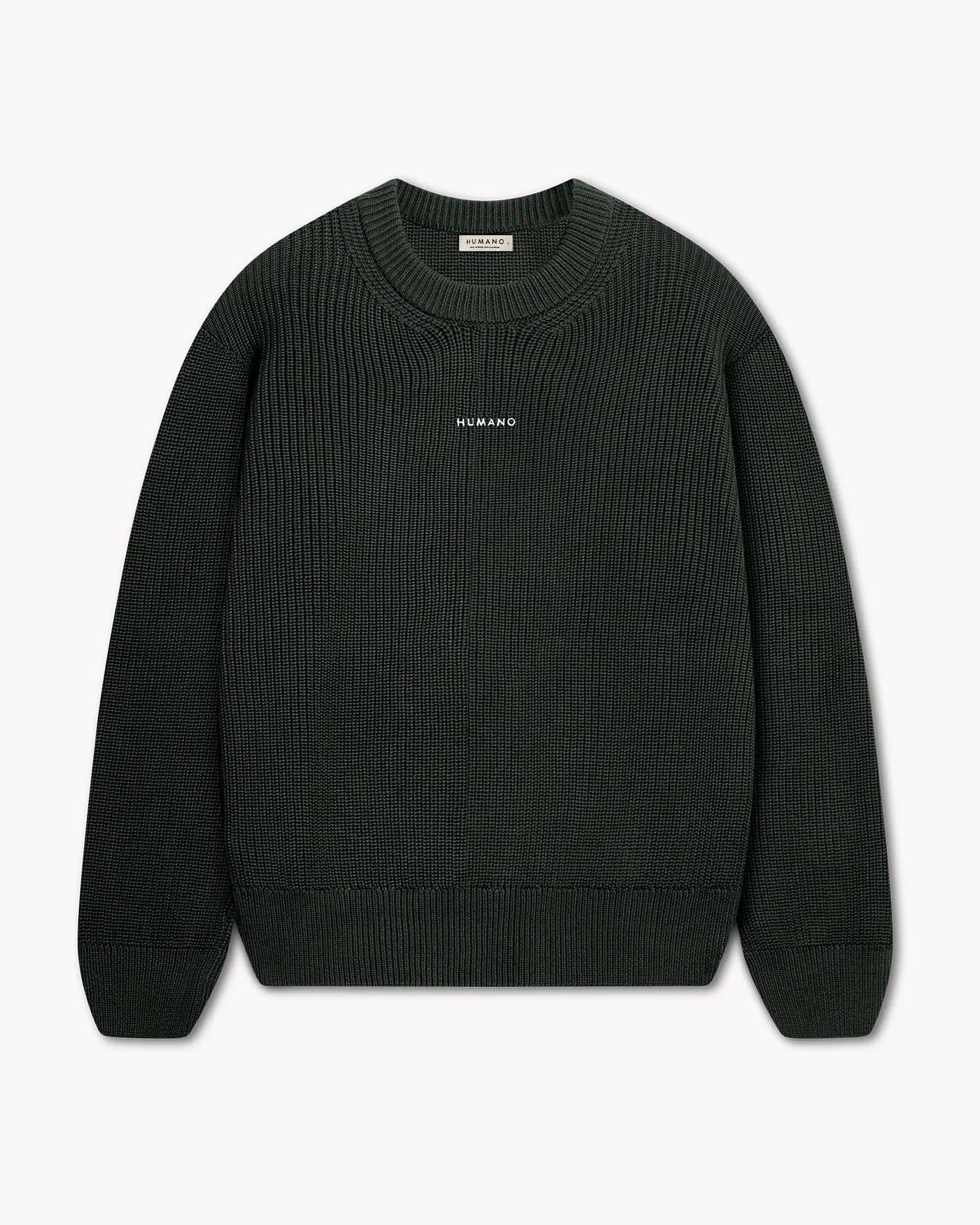 The long-awaited knit. 100% Organic Cotton knitted crewneck sweater with the classic and minimalist Humano embroidery on the chest.