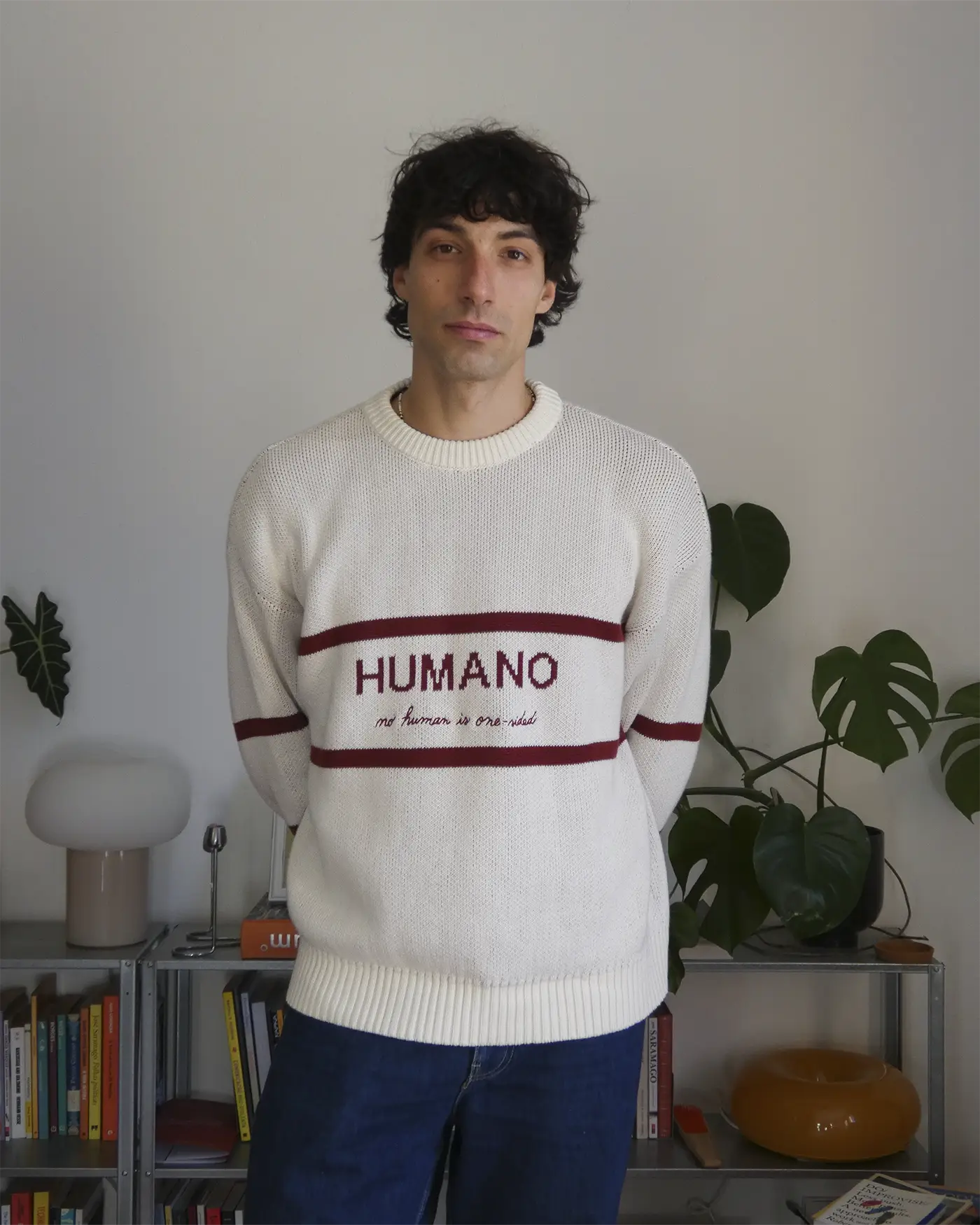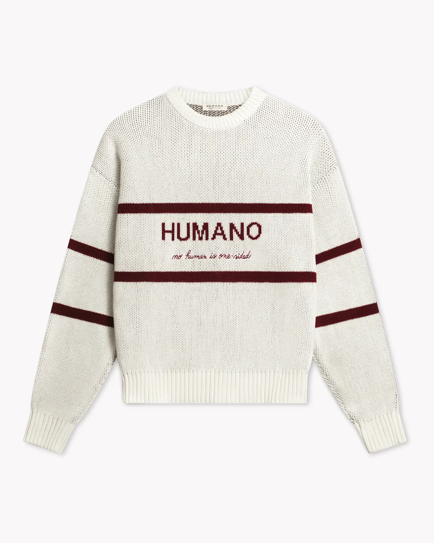 100% Organic Cotton jacquard knit sweater with a bold Humano graphic and our “no human is one-sided” statement embroidered on the front.